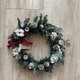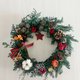 森林風花圈裝飾以原木色、紅色、金色為主色