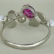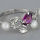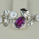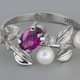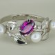 Floral 14k gold ring with oval garnet, diamonds and pearls.