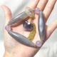 呼應煙灰紫瑪瑙的色彩,以**紫玉瓍**珠妝點於古董長珠間,並以**冰黃瑪瑙**戒(**一元復始、萬象更新**)佐**藍紫纏絲瑪瑙心(心想事成、一葉成功)**、金流蘇編製主墜。