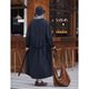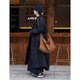 踏入秋日的儀式感,不妨從一件風衣裙開始,潛意識裡的季節屬性。翻領,打開是西裝領形,略大的樣子,不必忌諱的露出脖頸。斜門襟,雙疊門襟寬度,扣一紐扣,紐扣絕對是點晴之筆,用黑色牛角扣與手勾扣間隔,手勾扣是靈魂,在這一身黑之下,增加小小的女性化元素,但是又不過頭的。純手工拉成的,一根接一根線圍繞著紐扣,中間再用麻色的線走一圈粗粗的拱針,形成黑色大圈紐扣裝麻色小圈的風格。