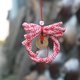周圍以日本傳統縮緬布製成的紅色蝴蝶結點綴。紅色在日本文化中象徵驅邪、愛情與生命力。紅底配上白色紋樣,設計華麗又雅緻,讓人心情愉悅,也展現濃厚的和風之美。