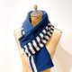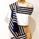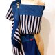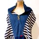 這件作品結合了條紋、方格與細緻的黑色亮片,在海軍藍與乳白交錯下,共譜一首微微帶著海風的歌。整件作品由立體的格紋毛料和鋪滿細碎閃耀的黑色亮片布料為主體,以不同材質與色階的藍色布料做為平衡。