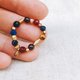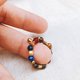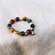 此款戒指使用多種水晶寶石,紅瑪瑙、青金石、虎眼石、石榴石,以及數種不同造型的黃銅珠,燈光下,閃爍不同寶石的色澤及透度。