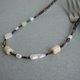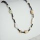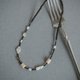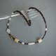 深棕色切面煙晶珠鏈,清透體淨;藍、黃色虎眼石小珠將堇青石、珍珠、黃色海藍寶、紫螺貝、菱形巴洛克珍珠、啤酒晶、亞馬遜石排列隔開,設計復古隨性。
