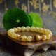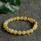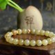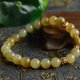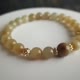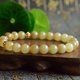 勻稱玲瓏,珠徑約8mm的和田玉糖料,每一顆玉珠皆呈現出從淡淡的紅糖色到糖料白肉的天然漸變,色調柔和交融。糖色部分濃郁卻不沉悶,白肉處清透又帶有糖料色系的底色,整體如淡彩渲染。細看可見玉質結構細膩,水頭充足,光澤溫婉,觸手冰沁後又帶來溫潤。