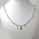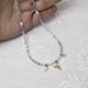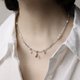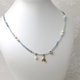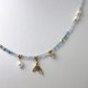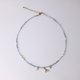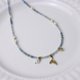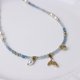 項鍊串接了細膩切割的淺藍晶石,帶來通透的海洋質感,佩戴時感覺輕盈涼爽。數顆高品質的淡水珍珠均勻分佈其中,增添了溫潤的光澤與優雅氣質。中央的幾個金色小墜飾是設計巧思所在,尤其是那充滿奇幻色彩的美人魚尾造型,為整體注入一絲俏皮與獨特。