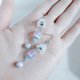 すりガラス風のホワイト色のすずらんビーズをメインに幻想的なマットライトアメジスト色が素敵なつるんと可愛いルナフラッシュに1サイズ小さめサイズのマーブルラベンダー色のファイアポリッシュチェコビーズ、優しく輝くガラスビーズなどを合わせたお洒落なピアス/イヤリングとなっております。