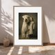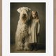 ●金髮小女孩和一隻白色老英國牧羊犬。他們並肩站立,像是兩個堅定的夥伴。她的表情嚴肅而沉靜,雙眼直視鏡頭,流露出超越年齡的成熟和穩重。