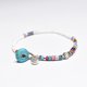 ターコイズブルーやブルーのシェブロンビーズ、シマシマ模様のカンネビーズ、レアカラーのホワイトハーツ、金赤色のホワイトハーツ、渋いピンク色のピンクマサイなどを繋いでいます。
