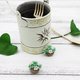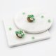 バスケット柄と緑の生地で包んだくるみボタン金具の上に、生地をつまみ細工で制作した小さな花を取り付けました。