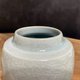 This jar was made from Japanese porcelain clay. I glazed the jar in a blue crackle glaze. Because I fired this piece in a reduction atmosphere the color varied in sections of the pot. The atmosphere in a reduced kiln can be unpredictable, resulting in not to be repeated pottery. All my glazes are food-safe.
