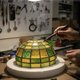 這款檯燈延續了經典的蒂芙尼(Tiffany)燈具製作傳統,每一片玻璃都是經過精心挑選與手工切割,再由匠人巧手焊接而成。黃綠與深綠色調的玻璃,交織出如同自然風景般的豐富層次,讓光線穿透時呈現迷人的斑駁光影。