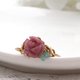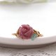 脇に添えられたブルーオパールが小さなリーフの役割を果たし、薔薇モチーフの完成です。
