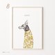 I have created a piece that delicately merges a Doberman, drawn with a pen, with a beautiful textile pattern, bringing out the elegance of the Doberman even more.