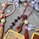 每款吊飾均手工製作。蓮花五條經文的流蘇部分採用七彩手搓棉線,展現生動的視覺效果,為整體增添俏皮感;同時搭配霧面湖水綠的岫玉裝飾珠,為耳目一新的設計添妝加彩。獨特的掛繩鈕扣珠選用水晶爆裂的阿拉善,將天然石材的光澤與質感融入作品中,呼應了其旅程與意象。
