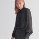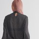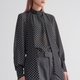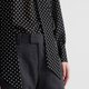 精細日本人造絲的黑色圓點點面料,輕柔飄逸的觸感一穿絕對愛上。立領領型以不規則抓皺方式,頸部線條顯得更加立體不單薄。頸部銜接兩條綁帶,無論讓是率性垂放或是綁起蝴蝶結都能有不同風格呈現。誇張的蓬鬆袖型讓柔美的上衣增加氣勢更有造型。微透卻又不透明的上衣可以兼具端莊又有些微的性感。無論搭配褲裝或是裙裝都能成為人群中的絕美焦點。