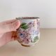 這款以日本人喜愛的紫陽花為主題的湯呑杯,以淡雅色彩手繪出的花草,加上金彩裝飾下,呈現出京都的風雅之情。杯內也有著花草圖紋,讓喝茶多了一份美好的心情。手作風情的雅緻茶杯,也是做為婚禮或喬遷之喜贈禮的最佳選擇。