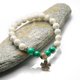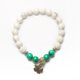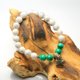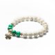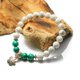 【特徵】運用了孔雀石與白紋石搭配製成的七輪手串。運用了大量白紋石中包含著四顆孔雀石的設計,本身帶有【守護】的概念。並且再搭配上代表著【繁榮】的五葉草裝飾,能增強整體手串的祈福效果。長期佩戴的話能淨化身心,並且給身體帶來好的影響,讓人免受災難。
