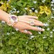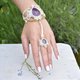 White bohemian macrame ring bracelet with chrysocolla and chrysoprase or two amethyst crystals. It is decorated with brass beads. Wrist band size is adjustable with a slide knot. Ring size is custom made. Please send me your middle ring circumference.