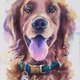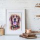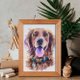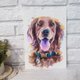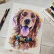 Watercolor painting with a portrait of pet painted on 100% cotton paper. Bright positive painting with cute dog will give a good mood. Colorful art will decorate the interior, add a creative accent.
