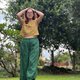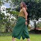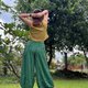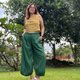 Beautiful soft elegant cotton fabric. Made into long loose volumed leg pants. Side elastic waist with front zipper and button closure. 2 side roomy pockets.