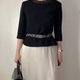 這件黑色的Chloe 上衣設計優雅,修身剪裁,勾勒出身形曲線,腰部略為收緊,下擺呈現微微外擴的A字形,增添幾分俏皮感與層次感。袖子為七分袖設計,十分顯瘦,袖口整齊,顯得乾淨俐落。