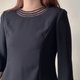 領口是這件上衣的一大亮點,採用圓形設計,並以多層黑色網紗拼接,創造出透明與立體的視覺效果,既增添了設計感,又帶有一絲低調的性感,同時保持整體的優雅氣質。