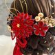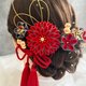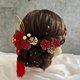- 以正絹及古著物布料手工製作的紅灰色摘み細工髮飾,散發復古現代優雅感。珍珠、水引及髮夾皆搭配金色,為婚禮、典禮及特別場合增添精緻氛圍。