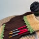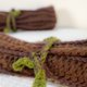 鉤織線條模仿年輪與木紋,綁繩尾端點綴葉片與毛茸橡果,材質為菜瓜布。
