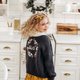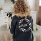 On the back of the cardigan, flowers of white, pink and burgundy flowers with green and blue leaves are embroidered in a circle.