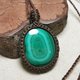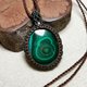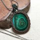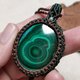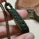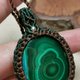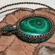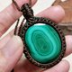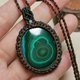 這是一顆兩面各有不同風采的孔雀石,也製作雙面皆可配戴的設計;為了整體看起來更加扎實,包框做雙色圖騰編織