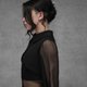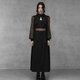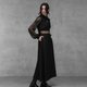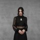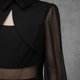 以小外套式結構剪裁結合珍珠紗的半透視質感,巧妙勾勒胸前與腰間線條。俐落的西裝布料與輕透紗材形成異材質對比,展現個性與優雅並存的氛圍,是兼具造型感與正式場合氣場的焦點洋裝。