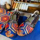フロントにブルー×ゴールド×オレンジの幾何学と花模様の刺繍の帯