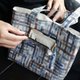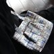 柔軟的布料上交錯著靛藍與灰褐的筆觸格紋,