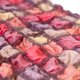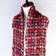 3色の絹糸とウールの格子デザインを大判サイズに織り上げ、その後に縮絨をかけて約半分のサイズにしました。ウールだけ縮んで絹は縮まないので、ポコポコと膨れ上がったテクスチャーになり、たて糸とよこ糸の色が合わさり奥行きのある色合いになっています。