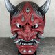 - Red Demon Hannya Mask — wearable mask with a cracked finish, aged-silver horns and fangs, crafted from high-quality PLA plastic and painted with acrylic paints and protective varnishes.