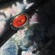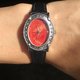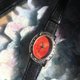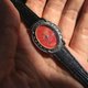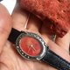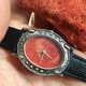 黑皮革配紅珊瑚橢圓雕花錶面,比較典雅而酷酷的款式。