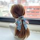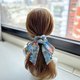 使用兩款不同的美國品牌棉布搭配製作成長尾蝴蝶結、加上緞帶和釘珠做成的髮圈,氣質浪漫,無論上班或休閒聚會都適合配戴。