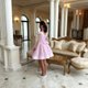The elegant pink satin and tulle dress with long, delicate, slightly sheer sleeves. The bodice is smooth structured satin, and the skirt is full and voluminous, made of multiple layers of soft pink tulle.