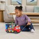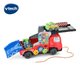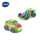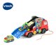 內附一台跑車、一台賽車。將兩台車裝進或放在運輸車上,即觸發有趣音效與語音。按下運輸車上方平板台面按鈕,可降下平台,調整滑道,讓兩台車快速滑行並回到賽道上。翻轉運輸車平板台面,即可搭建一個維修平台。