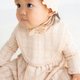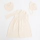 オーガニックコットンの糸でやさしく編みあげたニットのセレモニードレス、フード、スタイの3点セットです。全体の透かし柄、リブのスカラップ、裾の繊細な編み模様、ピコット加工など可愛らしさ満載。