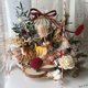 ● 材料:進口不凋葉材多種、索拉花材、手工花材、麋鹿公仔2隻、鳥籠花器、聖誕果實、日本薊花、日本旱雪蓮、圓木片、泡泡草、緞帶