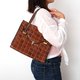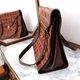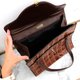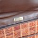 來自意大利的啡色鱷魚皮袋,上面的圖案由拼皮製成,方形設計增加容量,前後都有大口袋,大概可放A4對摺的文件。內部材質也是真皮,打開上方有 Niki Milano Italy 的金屬標誌,有一個大主隔層,可容納11 吋平板電腦。