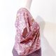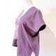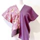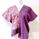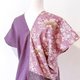 這件紫色作品有輕柔的純棉古典日式圖騰印花布料和同樣來自日本的紫色色色棉麻組成,帶著淡淡色彩的紫色花朵繽紛,由素面飽和的紫色襯托,氣質高雅。搭配深紫色水紋色塊拼接與不對稱的長短設計,讓四角衣多一份率性的設計感,更適合日常搭配著用。只要簡單搭配牛仔褲、短褲,或白色寬褲都很率性舒適。