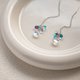 這款耳環融合了施華洛世奇的極光水晶和三顆藍色漸層的捷克水晶,以925純銀耳鍊巧妙串聯,展現出迷人的藍色光澤。大水滴和小水滴交相輝映,如同綿綿細雨般從耳畔垂落,營造出一種柔美而浪漫的氛圍。