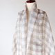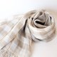 京都の糸問屋から取り寄せた上質な生成りの亜麻(リネン)と、晒した白の苧麻(ラミー)を使って、8枚綜絖の変形綾織技法で手織りした大判ストールです。麻独特の落ち感としっとり感があり、強いハリやゴワつきもなく、とても軽やかにやわらかく身体になじみます。