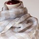 シンプルな2色使いの格子ストールですが、光を受けると織柄の違いにより奥行きが生まれて8色に見えます。両端には天然色のタッサーシルクを使っており、金色のラインが優しく格子柄を引き立てるデザインです。