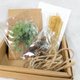 不凋雪松一包、隨機聖誕裝飾一包、空白水彩紙一張、牛皮卡紙一張、金色緞帶一段、牛皮紙製外盒一個