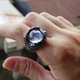 岩石般的戒身,中間鑲嵌天然藍暈月光石;寶石經過光線的反射,如同在月光下被群山擁抱著的湖泊,因為月光的倒映,泛著迷離光暈的湖水。而寶石中內含天然的冰裂紋,就像在冬天結晶的湖面一般,呈現經過自然洗禮的耀眼光華。