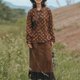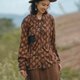 - 這件針織棉襯衫以深咖為底,暖咖乾果印花如松鼠精心儲藏的冬糧,鋪陳出秋日森林的豐饒圖景。 香雲紗拼布在領口、胸前與後背悄然點綴,如樹影斑駁;茸茸毛邊則似落葉邊緣的天然捲曲,透著不經意的軟萌。 牛角釦如真正的松果垂落門襟,每一粒都泛著油潤光澤